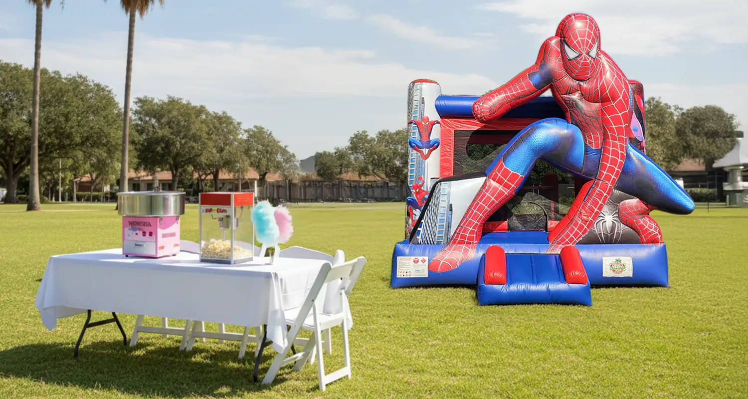 Most inflatables need one 110V outlet within 75–100 ft per blower. Each concession machine needs its own 110V outlet on a stable table surface. Waterslide packages also need a standard garden hose to reach the setup area. Generators are available if outlets are far.