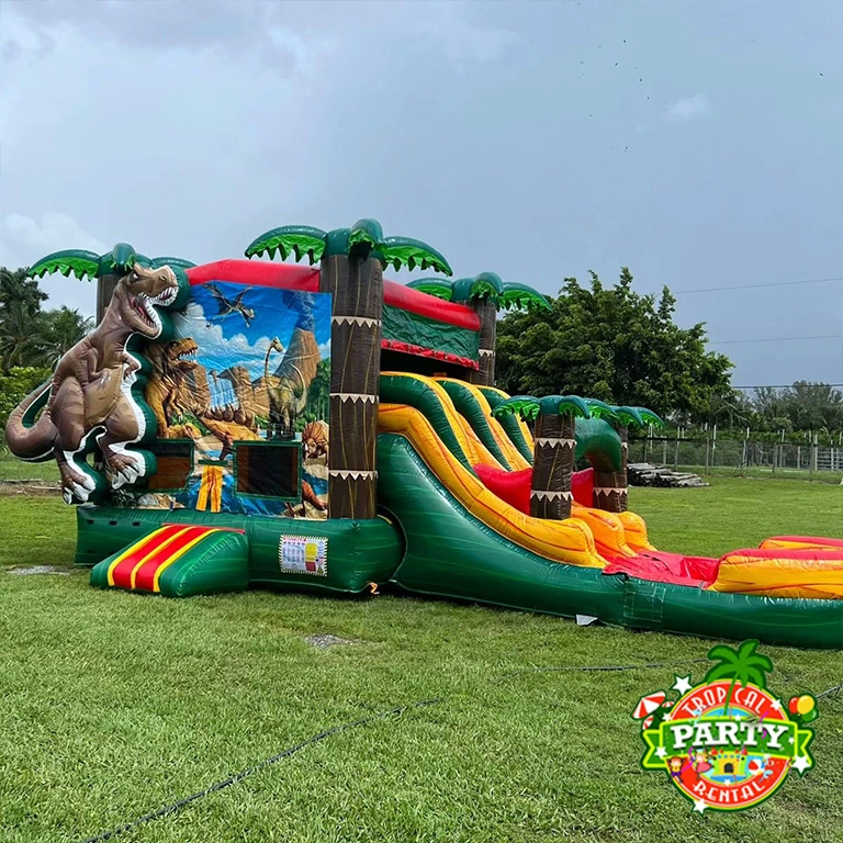 Step back into the Jurassic era with our T-Rex Double Lane Combo! This thrilling inflatable features a giant, roaring T-Rex, palm trees, and vibrant prehistoric artwork that kids love. It includes a spacious bouncing area, climbing wall, and two slides for double the excitement. Perfect for dinosaur-themed birthdays and backyard adventures in Miami — guaranteed to make your party roar with fun!